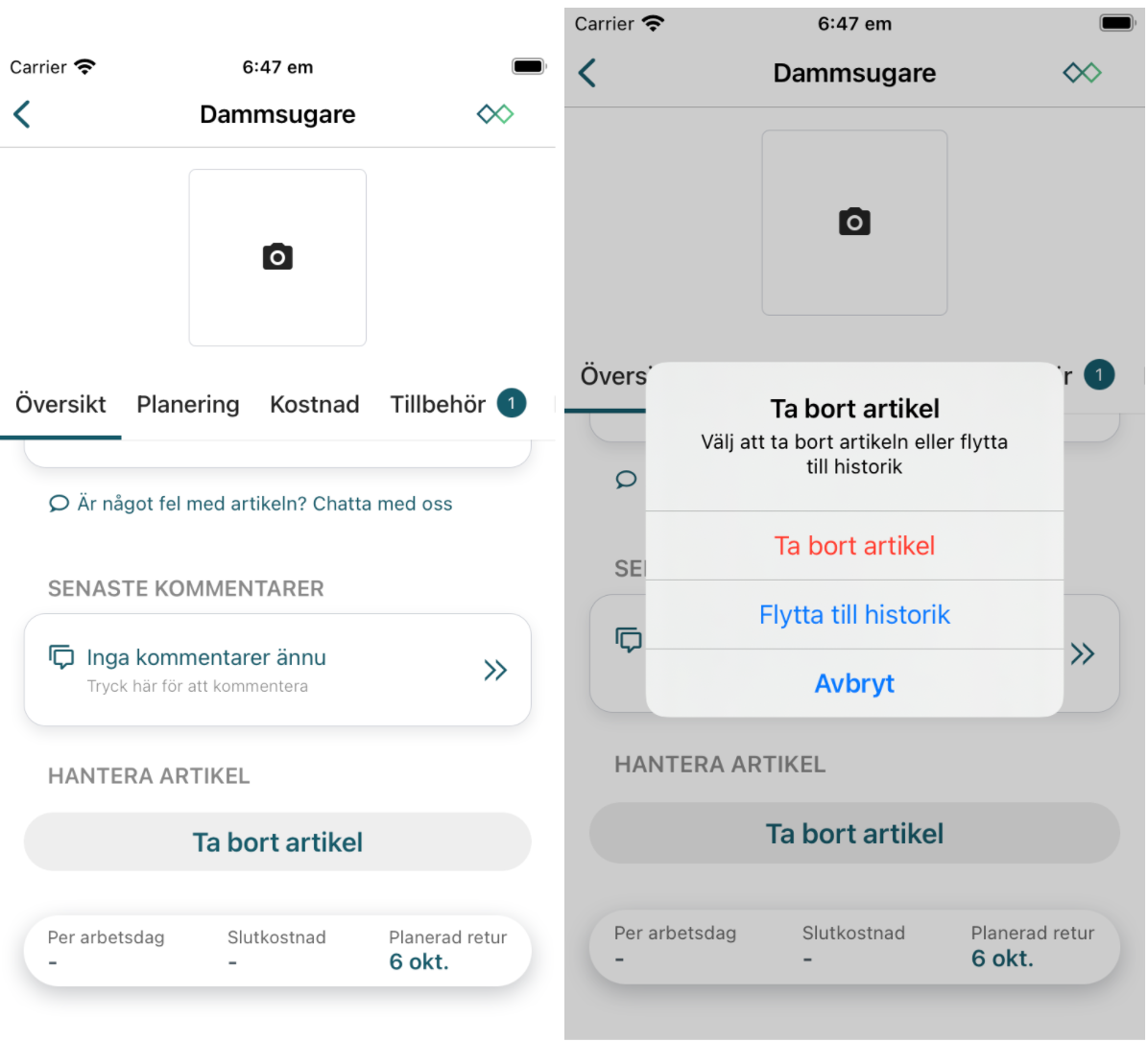 To delete an item, navigate to it, scroll to the bottom and click on "remove item". You will then have two options, either delete it permanently, or move it to "Confirmed return".