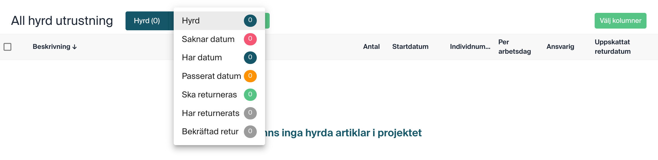 In addition to the new view, we have also moved sub-filters (eg "Missing date, Passed date", etc.) for rented equipment to the top of the list in the Project view: