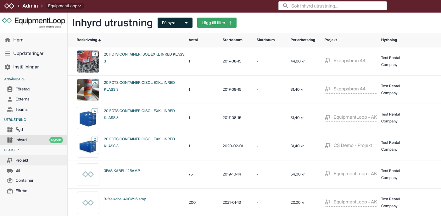 The function makes it possible to get an overview of all rental equipment for the entire company. This applies to all ongoing and completed projects and all rental companys. Usages examples can be to see historical price development, price variations, ongoing rent per project or rental company and much more!